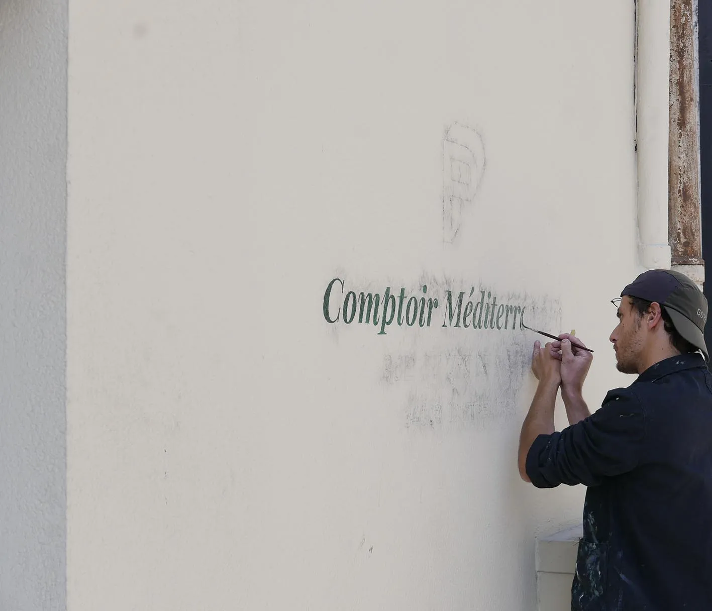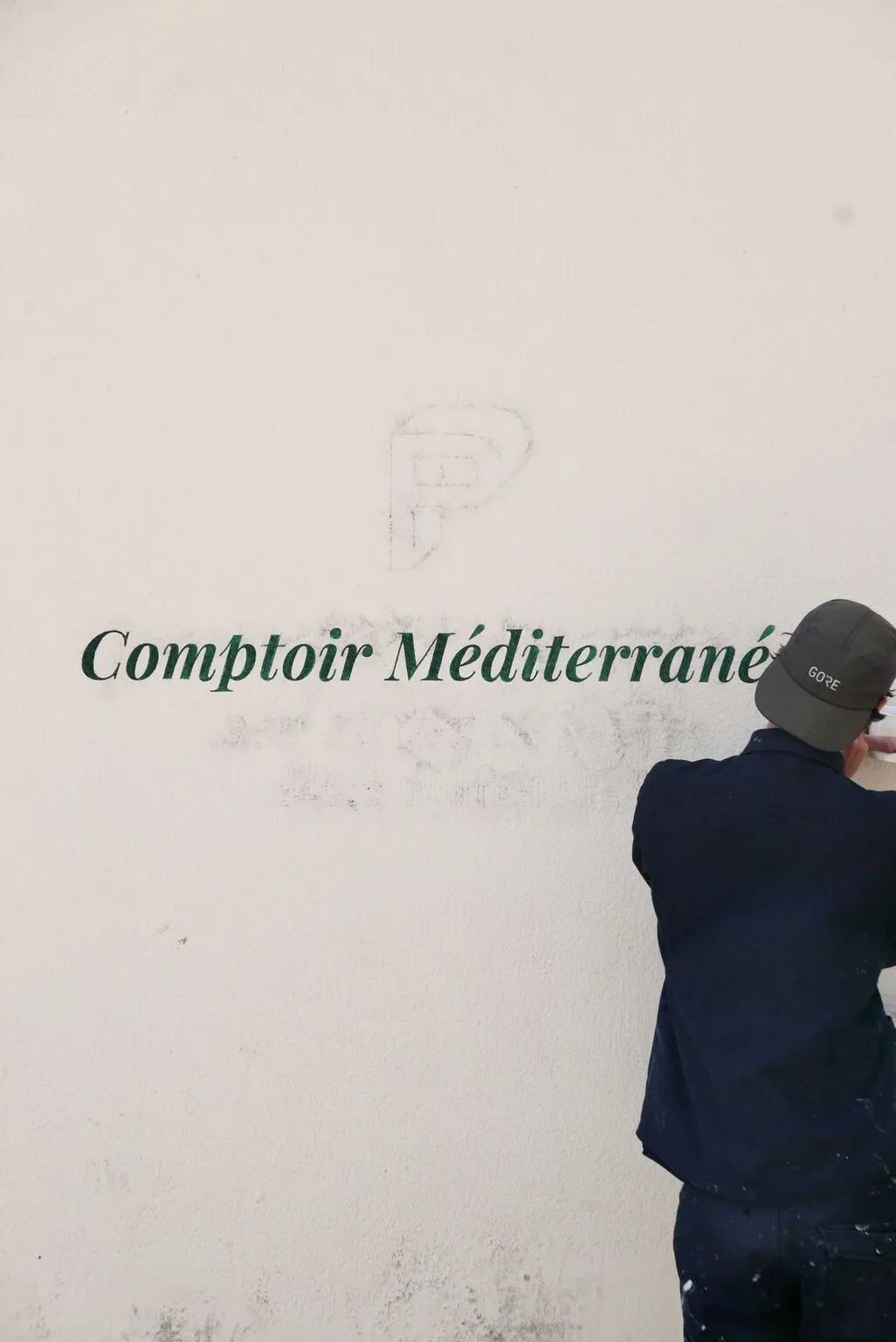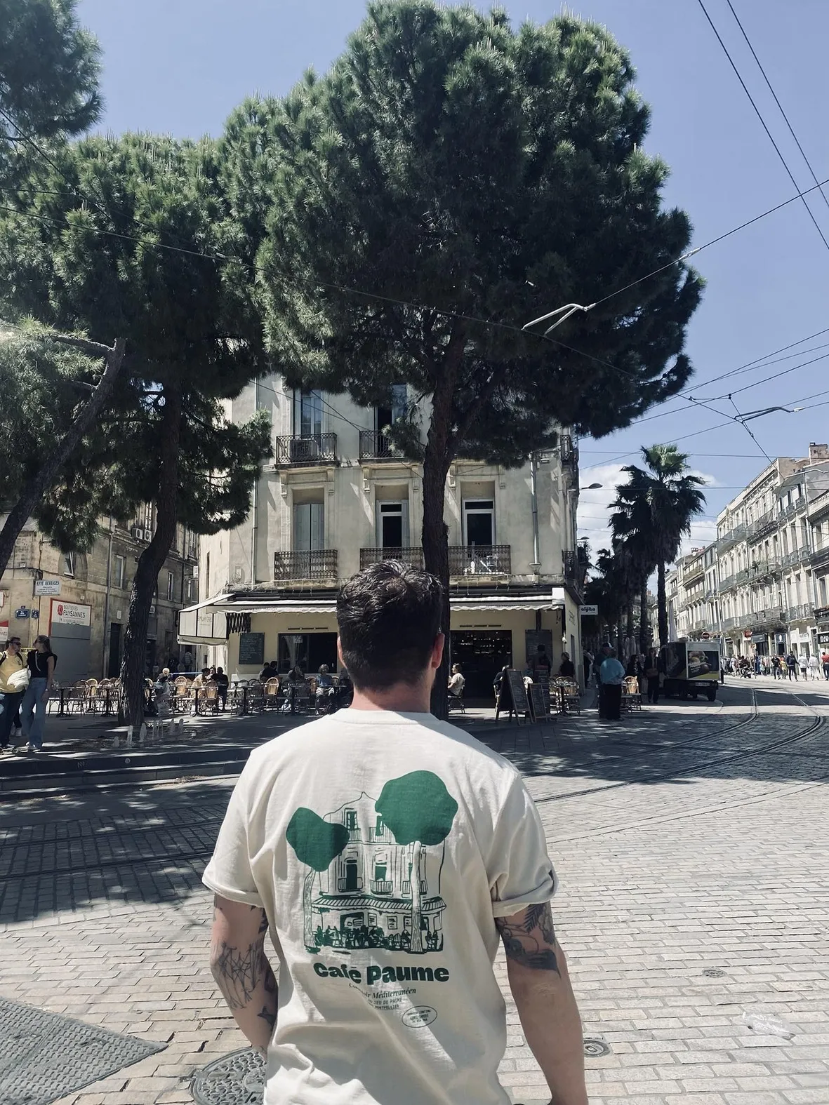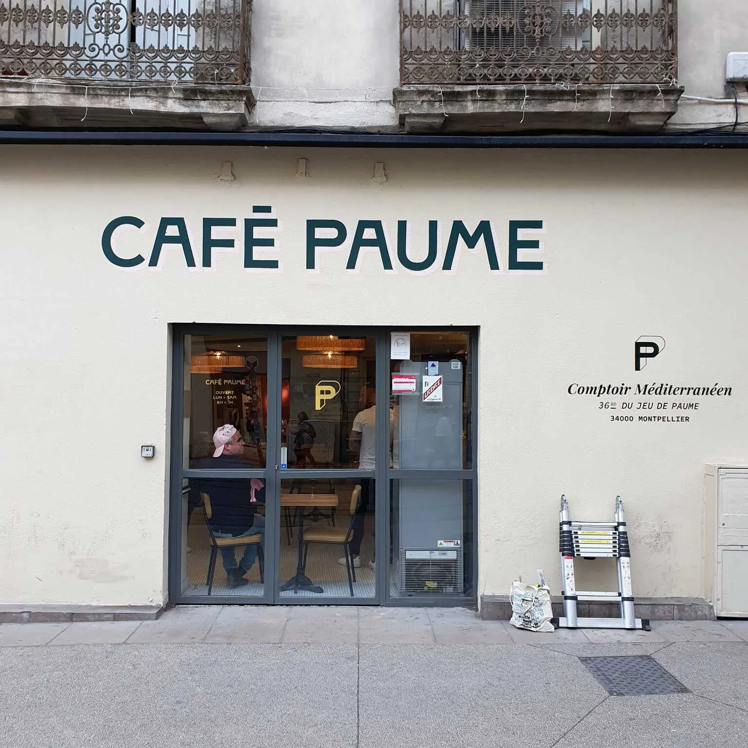 Pour l’ouverture de son nouveau café en centre-ville de Montpellier, Jérémie que nous avions accompagné sur le Café de la Mer à Montpellier et ses aventures au Grau du Roi a de nouveau fait appel à nous. Il a fallu écrire l’histoire de ce café afin de cerner l’atmosphère qu’il souhaitait donner avant de créer son identité visuelle ; Voici donc le Café Paume : « Ce lieu est une ré-interpretation de ce qu’est Montpellier. Une ville historique, aux codes architecturaux très classique français, le café se situe au pied d’un boulevard à la Parisienne mais la Méditerranée n’est qu’à quelques kilomètres. Montpellier c’est la ville aux portes de la mer, Paris avec l’accent d’ici, c’est le lieu de rencontre de l’Italie et de l’Espagne, du vin et du pastis, des sardines et du jambon, des coquillages et des oeufs mimosa. Un mélange de cultures et d’inspirations qui finit par s’organiser au moment de passer à table ou de partager un apéritif.Comme la Mama italienne qui trouve toujours de quoi faire plaisir à ses invités ou sa famille, au Café Paume la cuisine s’inspire du marché, se consomme comme aux halles, à table ou les plats s’empilent comme les tournées ou au comptoir où le cuisinier et le serveur vous parlent avec les mains. »C’est autour de cette histoire que nous avons créer l’identité visuelle du Café Paume. Pour rappeler ces codes du Café parisien, nous avons appeler notre ami Lucas, peintre en lettre sur Marseille. Un bonheur de voir nos dessins prendre vie sous son pinceau. Une collection de textile, un peu de papeterie, des accessoire parsemés ici et là pour construire, tranquillement, l’histoire du Café Paume.