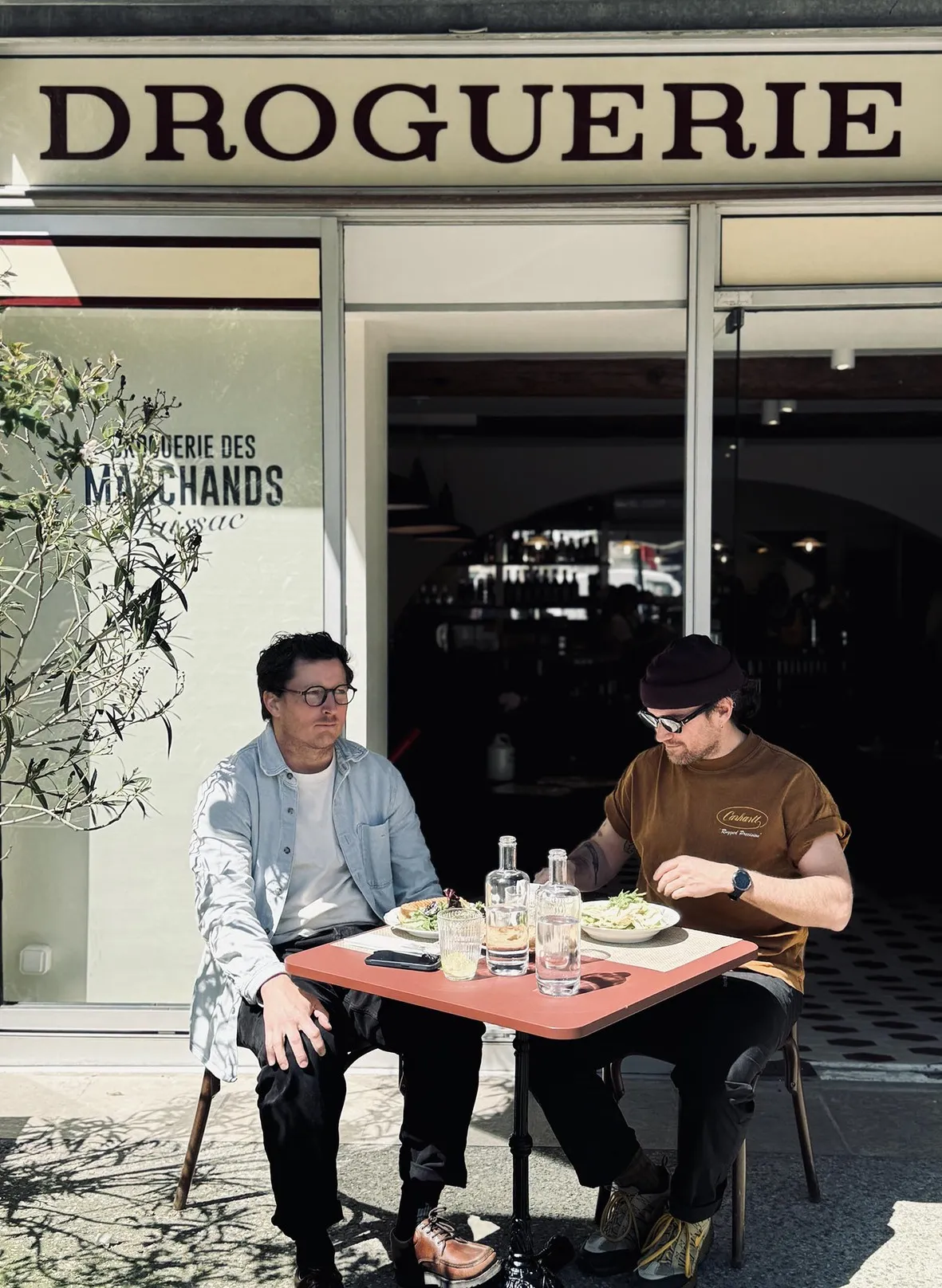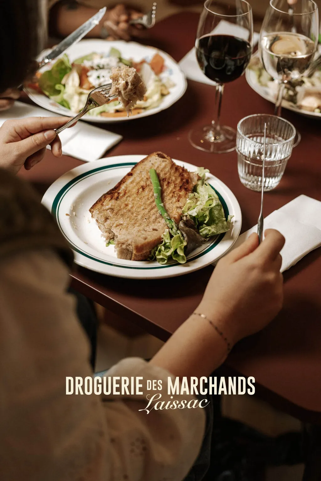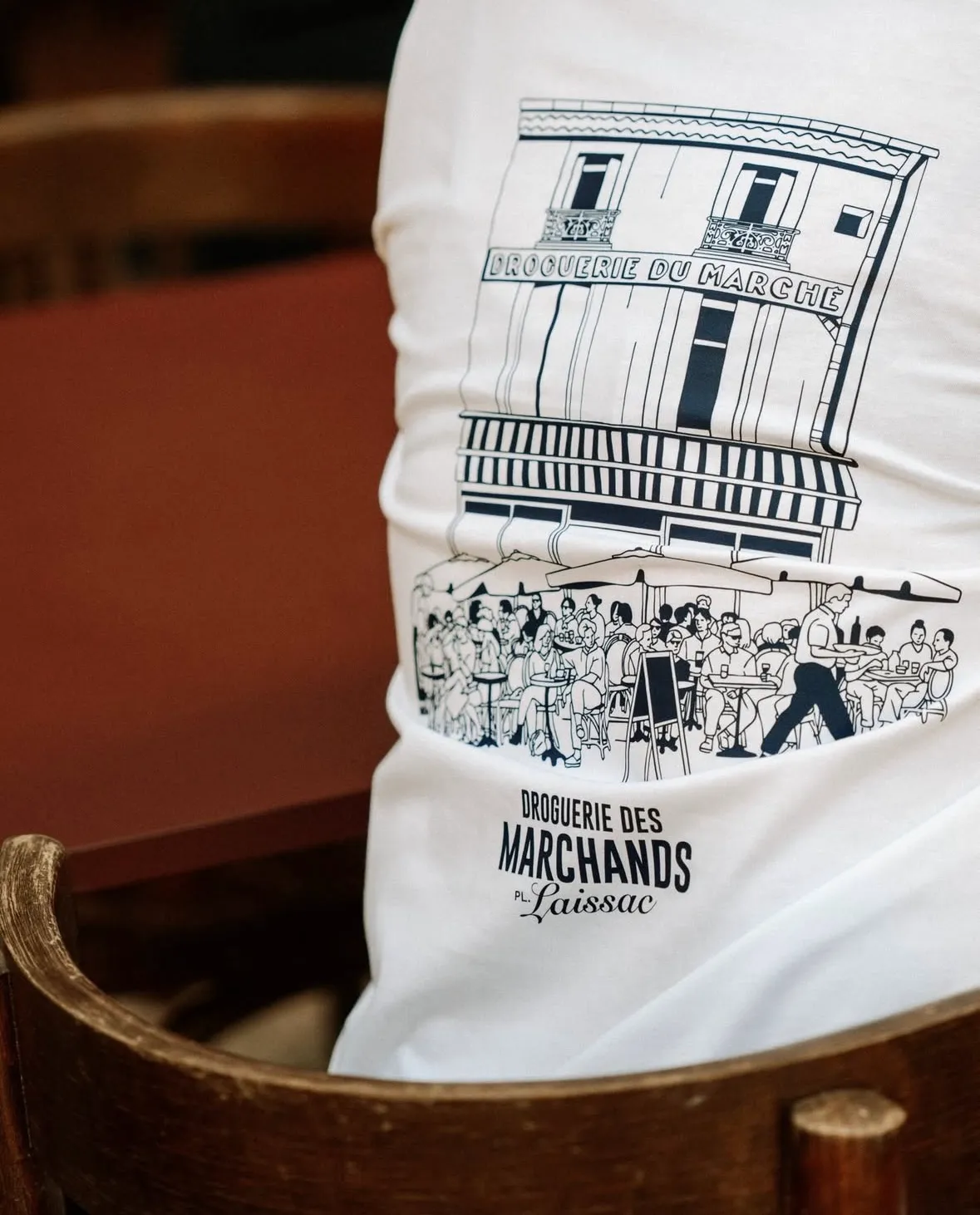 Bar des Marchands, Droguerie des Marchands… Mais c’est qui, ces Marchands ? Marchands de quoi ? De frissons. De nuits qui s’étirent. De toasts qui claquent et de verres qui trinquent. On aime les bons moments, ceux qui s’improvisent et s’étirent, ceux qui commencent par un apéro et finissent à l’aube, ceux qui ne laissent pas de place aux regrets. Alors on fait les choses en grand : un bar festif, un bar-restaurant, un aller-retour entre l’insouciance et le plaisir de bien manger. Pourquoi la Droguerie ? Parce que cet endroit a été une droguerie pendant trente ans. Parce qu’avant de soigner les âmes par le bon vin et les plats maison, on y vendait de quoi réparer, bricoler, panser les blessures du quotidien. Parce que les bons bars sont les nouvelles drogueries du cœur. Et au fond, on est tous des Marchands. Marchands de rêve, de souvenirs, de sourires, de rencontres volées sur un coin de comptoir. Marchands de boissons pour fêter, pour oublier, pour recommencer. Marchands de musique, les tubes d’hier, d’aujourd’hui, ceux que tu fredonneras demain. Marchands d’amour, de joie de vivre, de simplicité. Marchands de ce je-ne-sais-quoi qui fait qu’on reste un peu plus longtemps que prévu. Il y a à boire, à manger, à danser, à s’oublier, à se retrouver. Alors, tu viens ?